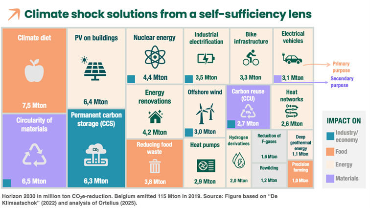 - Almost all climate solutions from The Climate Shock contribute to greater self-sufficiency for Belgium and Europe.