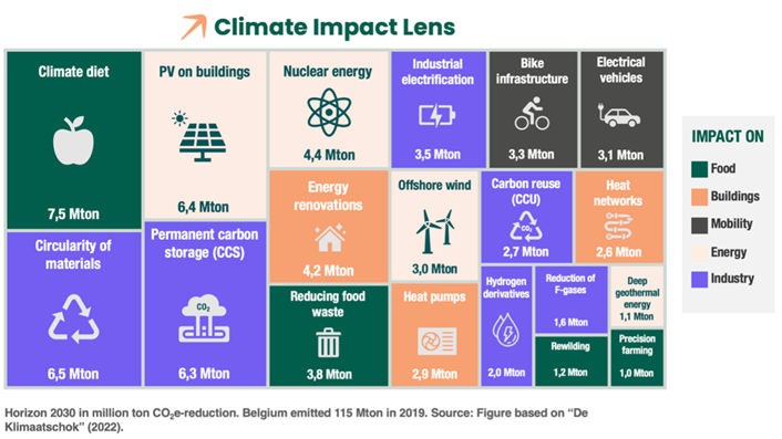 In The Climate Shock, we calculated in 2022 the CO₂ impact of twenty climate solutions for Belgium by 2030, resulting in a broad mosaic of measures. We grouped these solutions by theme: food, agriculture & land use, the built environment, mobility & transport, energy, and industry.