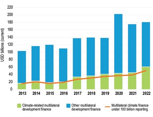 Figure1 : Multilateral development finance vs. climate finance (2013–2022). OECD Climate Finance Dashboard, 2024 data.