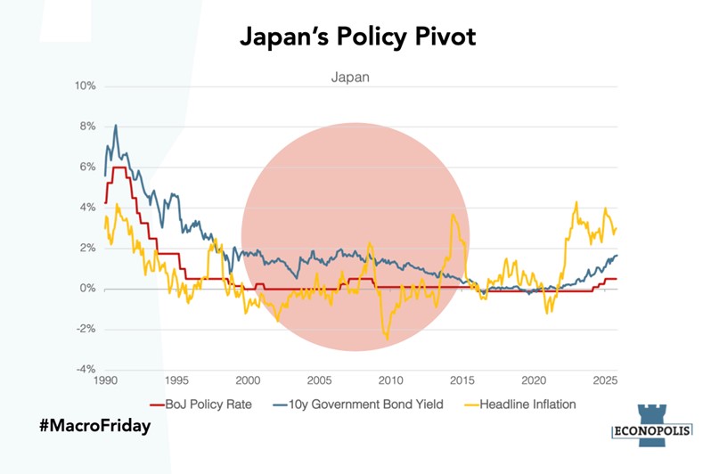 Headline inflation has remained above the Bank of Japan’s 2% target since April 2022, marking the longest period of above-target inflation in more than 35 years. While the initial surge was driven largely by higher fresh food and energy prices, underlying inflation has also firmed, albeit more gradually. During this period, the Japanese yen lost more than 20% of its value against major trading partners, fueling imported inflation. Together, these developments are reshaping Japan’s economic and financial landscape. Recall last year’s yen-driven volatility on global markets, which ultimately forced the Bank of Japan to intervene to support the currency.