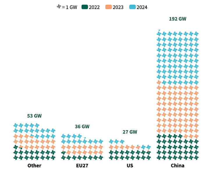 In 2024, total new wind additions globally reached 114 GW, only marginally below the 115 GW added in 2023. China again dominated the field, contributing 80 GW of that total. That’s a modest rise from the 75 GW it installed in 2023, but enough to cement its position at the center of global wind expansion. As of the end of 2024, China’s cumulative wind capacity stood at 521 GW out of approximately 1,132 GW globally, meaning China now accounts for nearly half of all installed wind power capacity. Despite China’s dominance, the overall global buildout has not accelerated; in fact, it plateaued. That slower growth is especially striking when compared with solar, which continues to break new records. The fact that wind additions fell slightly year-on-year (driven chiefly by a drop in European installations) is a red flag. In the EU, permitting hurdles, local opposition to onshore wind, and higher project development costs appear to be biting. Meanwhile, offshore wind development in key regions such as the U.S. has seen permit cancellations that could seriously slow future deployment.
