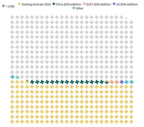Last week, we took a dive into solar PV additions in 2024, placing them against the 2030 NZE benchmark to see how far we’ve come. This week, we turn our eyes to wind power. It’s important to start from the same reference point: under the IEA’s Net Zero Emissions scenario, 2,742 GW of installed wind capacity (onshore and offshore combined) is needed by 2030. With solar surging, wind must also keep pace (or preferably accelerate) to make that pathway viable.