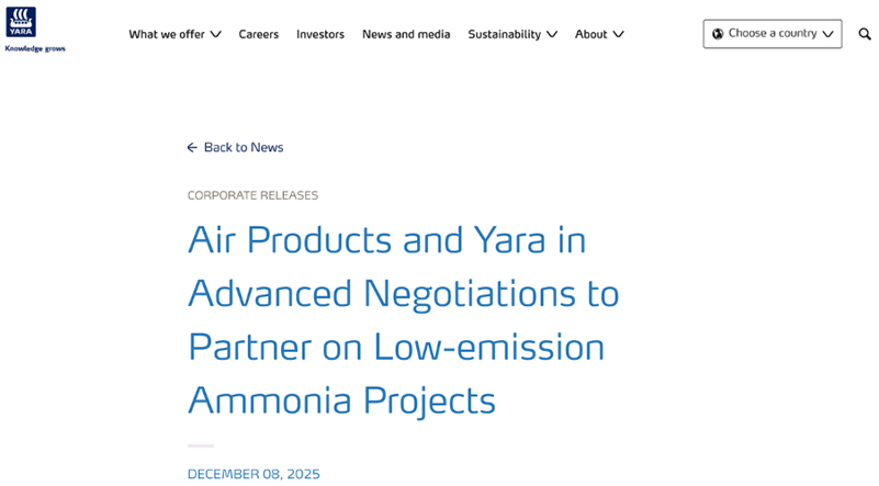 Bron: https://www.yara.com/corporate-releases/air-products-and-yara-in-advanced-negotiations-to-partner-on-low-emission-ammonia-projects/