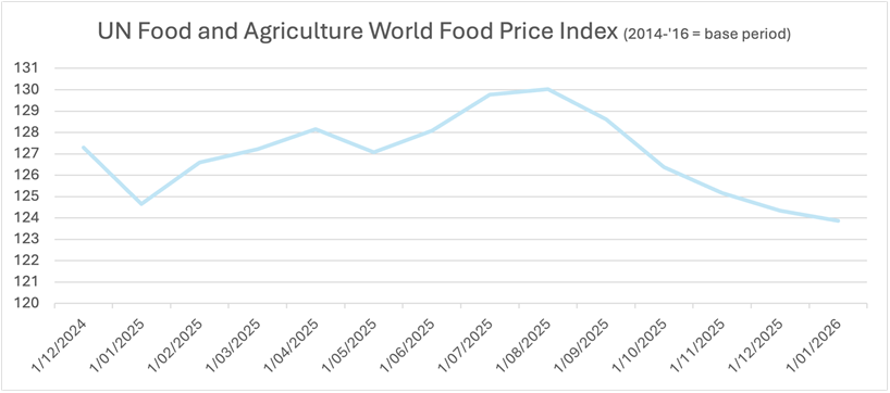 The ‘UN Food and Agriculture World Food Price Index’ is a globally recognized benchmark used to track the monthly change in international prices of a basket of food commodities. It essentially serves as a "cost of living" indicator for the global food market. The index tracks the prices of roughly 24 basic food commodities (derived from 95 price quotations) divided into five categories: cereals, vegetable oils, dairy, meat and sugar. Typically, these prices are a leading indicator for seed and fertilizer companies (like Nutrien, Mosaic, or Corteva); these stocks react within 3–6 months of a sustained rise in food prices. Equipment manufacturers, sellers of big-ticket items like tractors and harvesters (like John Deere, AGCO, Kubota or CNH) are of course lagging and their order books often only peak with a year's delay.