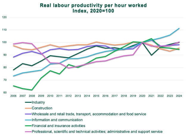 What do the data tell us so far? National productivity figures are currently available only through 2024. In that latest year, productivity growth picked up in several sectors with high exposure to AI, notably ICT and professional, scientific and support services. The acceleration is especially pronounced in ICT. In other sectors that are also investing heavily in AI, such as banking, no clear productivity effects are yet visible.