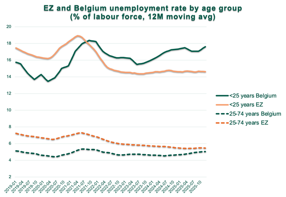 The key question is whether similar patterns are already emerging in our own labour market. To assess this, we look at unemployment data available through December 2025. In the euro area, there is no clear evidence of an AI-related effect on youth unemployment. In Belgium, youth unemployment has edged up slightly since September of last year, but this increase should be interpreted with caution. The increase remains small compared with previous fluctuations. Moreover, unemployment among those aged 25 to 74 also rose marginally, though less pronounced. At the same time, both the participation rate and the employment rate of young people increased in Belgium. In other words, more young people entered the labour force and actively searched for jobs—and many of them found one—resulting in a net rise in youth employment.