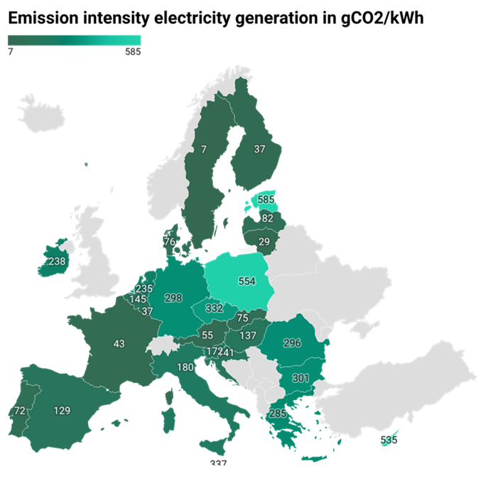 Figure 1: Emission intensity of electricity generation per EU-country in 2024. Source: Data from EEA.