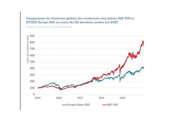 Au cours des 20 dernières années, les actions américaines ont enregistré des performances nettement supérieures à celles des actions européennes. Pour de nombreux investisseurs, ce n’est pas une surprise, mais l’ampleur de l’écart de rendement pourrait toutefois les étonner. Si l’on tient compte des dividendes et des fluctuations des cours, l’indice américain général S&P 500 a généré un rendement annuel supplémentaire moyen de 3,5 % par rapport à l’indice européen STOXX Europe 600 (rendement annuel moyen de 11,1 %, contre 7,6 %).