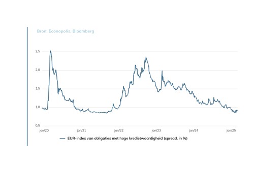 De afgelopen weken waren wat moeilijker voor bedrijfsobligaties. Ze daalden mee met de veilige staatsobligaties. Toch kan er zeker nog niet gesproken worden van een crisis in de bedrijfsobligatiemarkt. Integendeel, de extra rentevergoeding (spread) op bedrijfsobligaties bevindt zich nog steeds op een vergelijkbaar niveau als begin dit jaar en dat startpunt lag bijzonder laag. Juist daarom blijft waakzaamheid geboden. Als de correctie op de aandelenmarkten aanhoudt, zal de impact op bedrijfsobligaties waarschijnlijk toenemen.